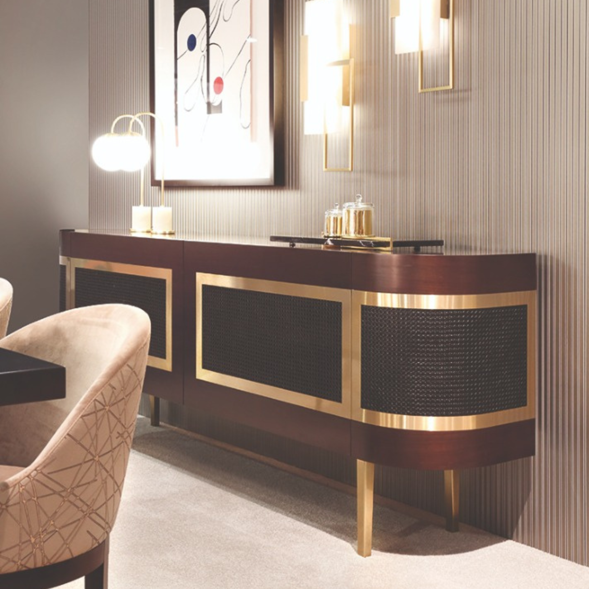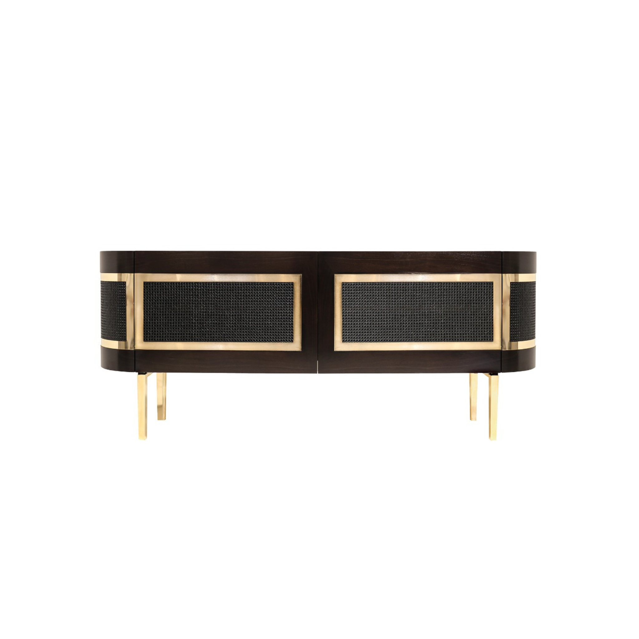 Inspired by luxury and nature, the Bullock Sideboard features a wooden structure with elegant gold-plated brass bars and intricate rattan details. This handcrafted sideboard includes two doors, providing both functional storage and a touch of sophistication to any modern interior.