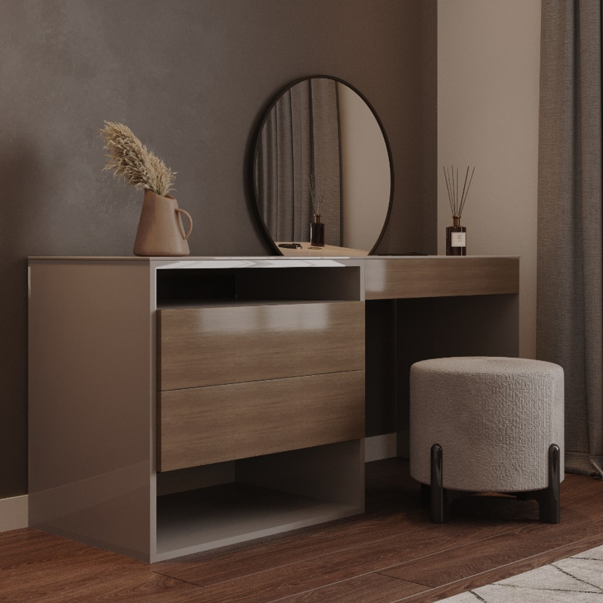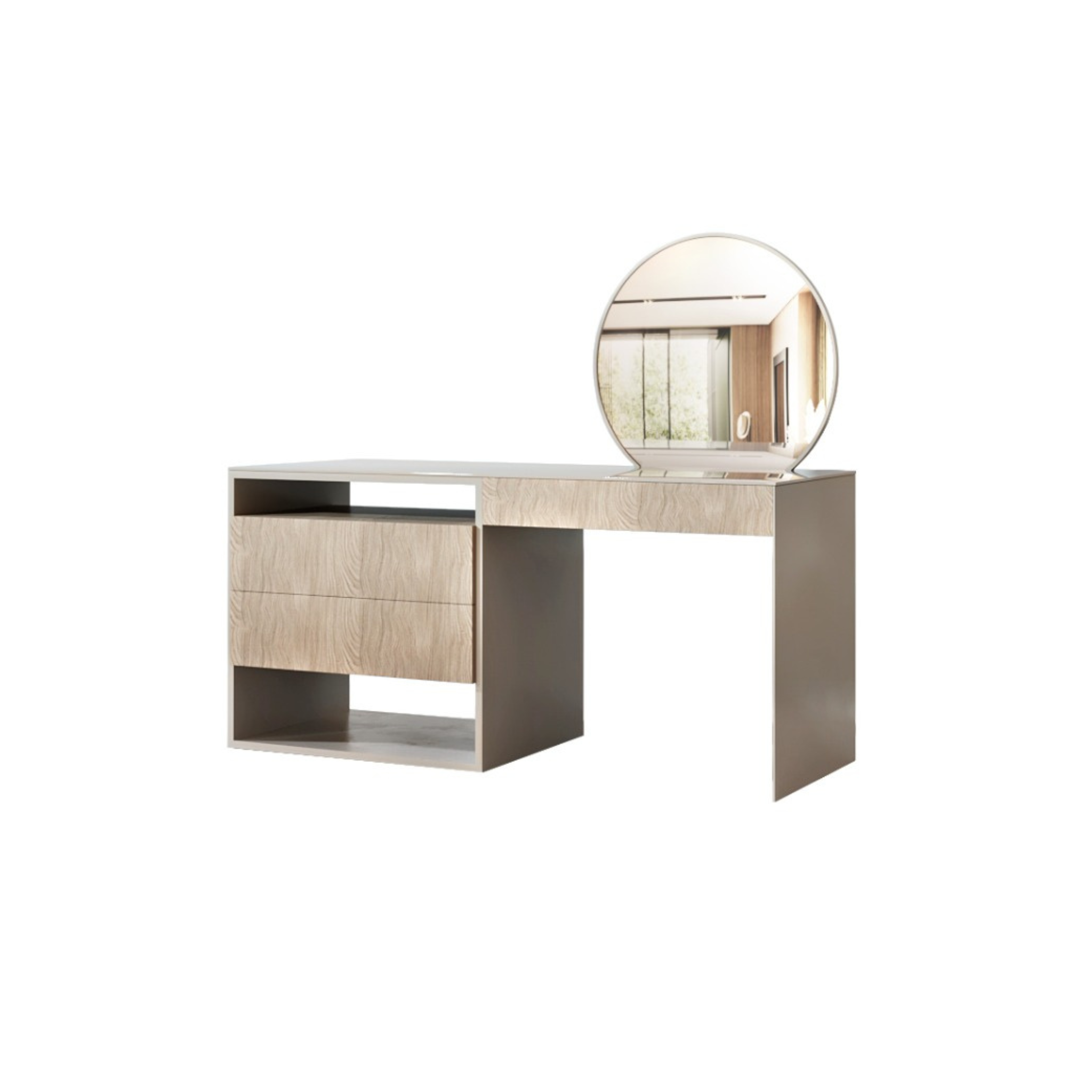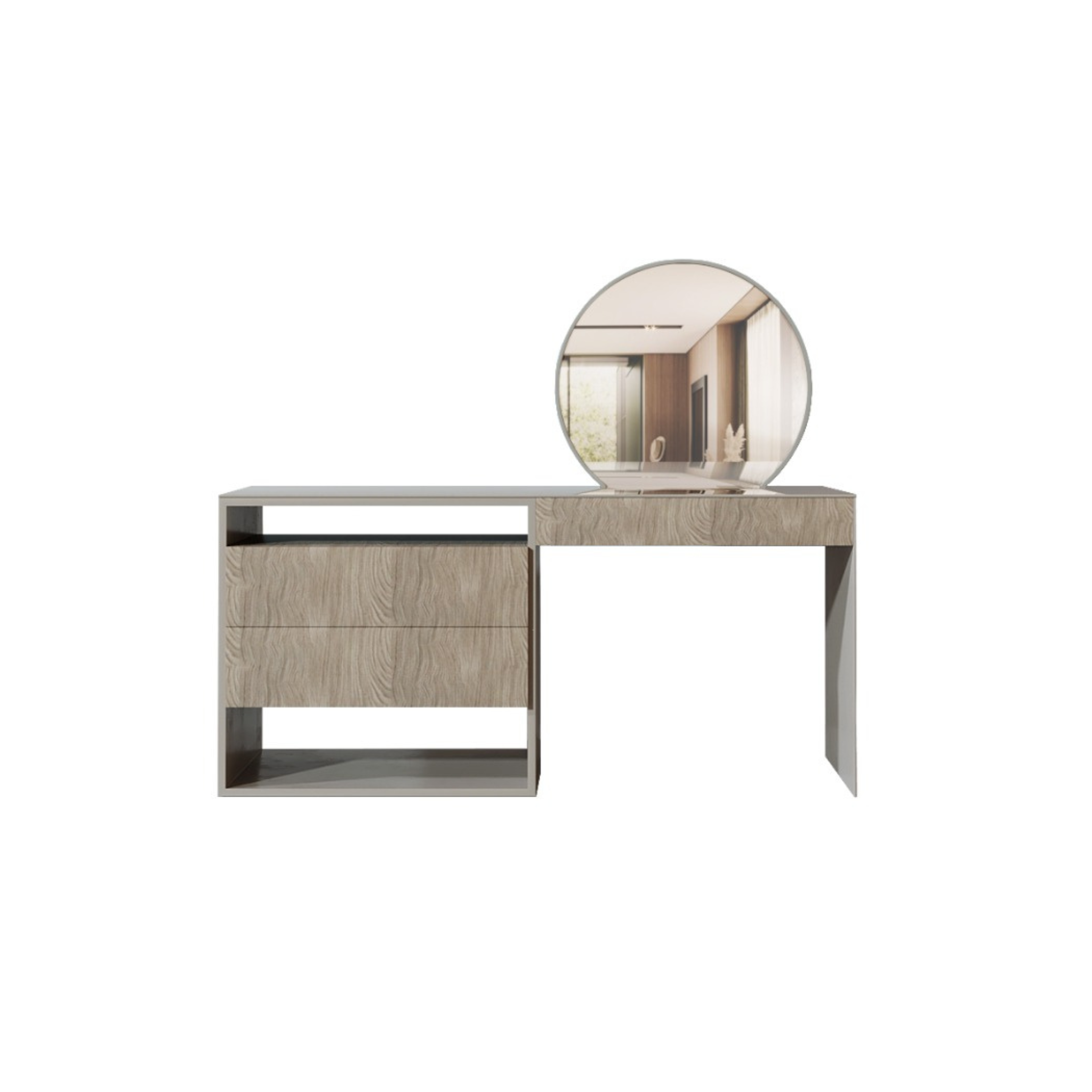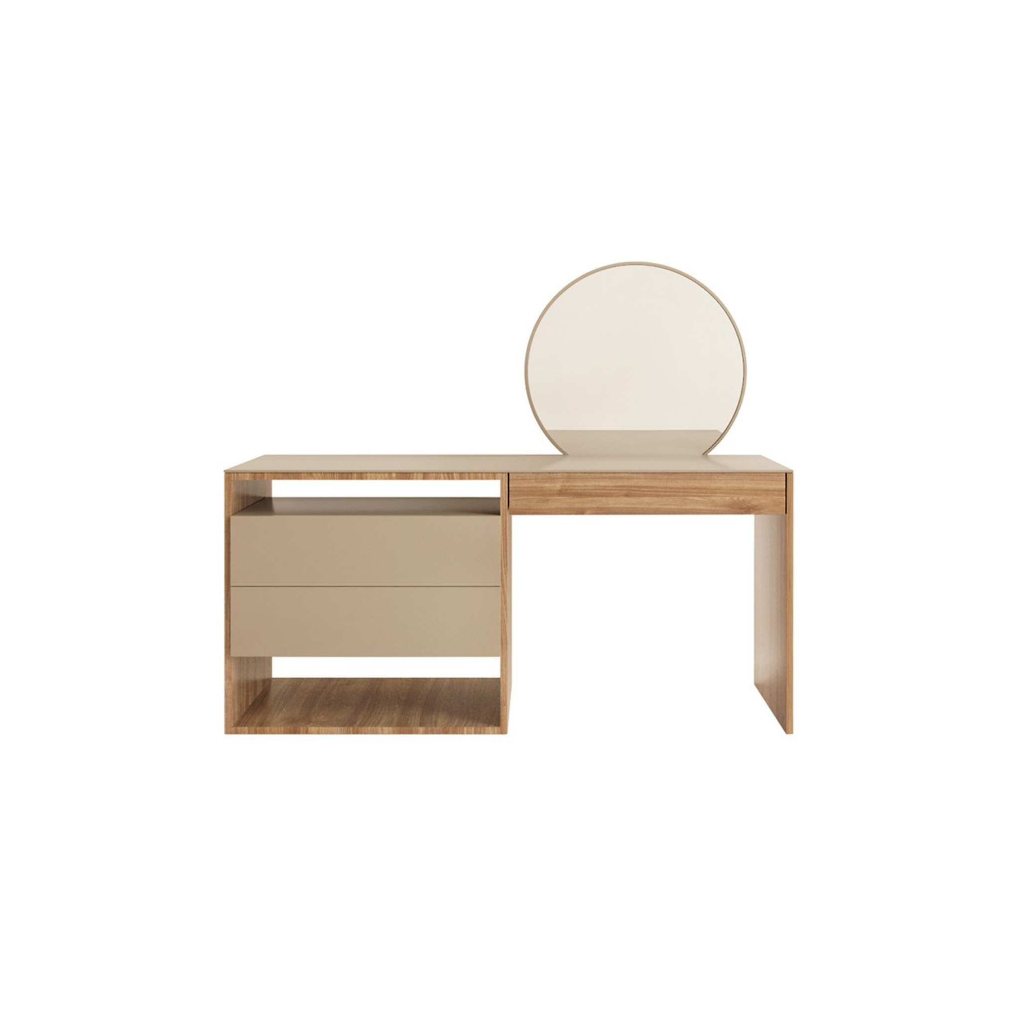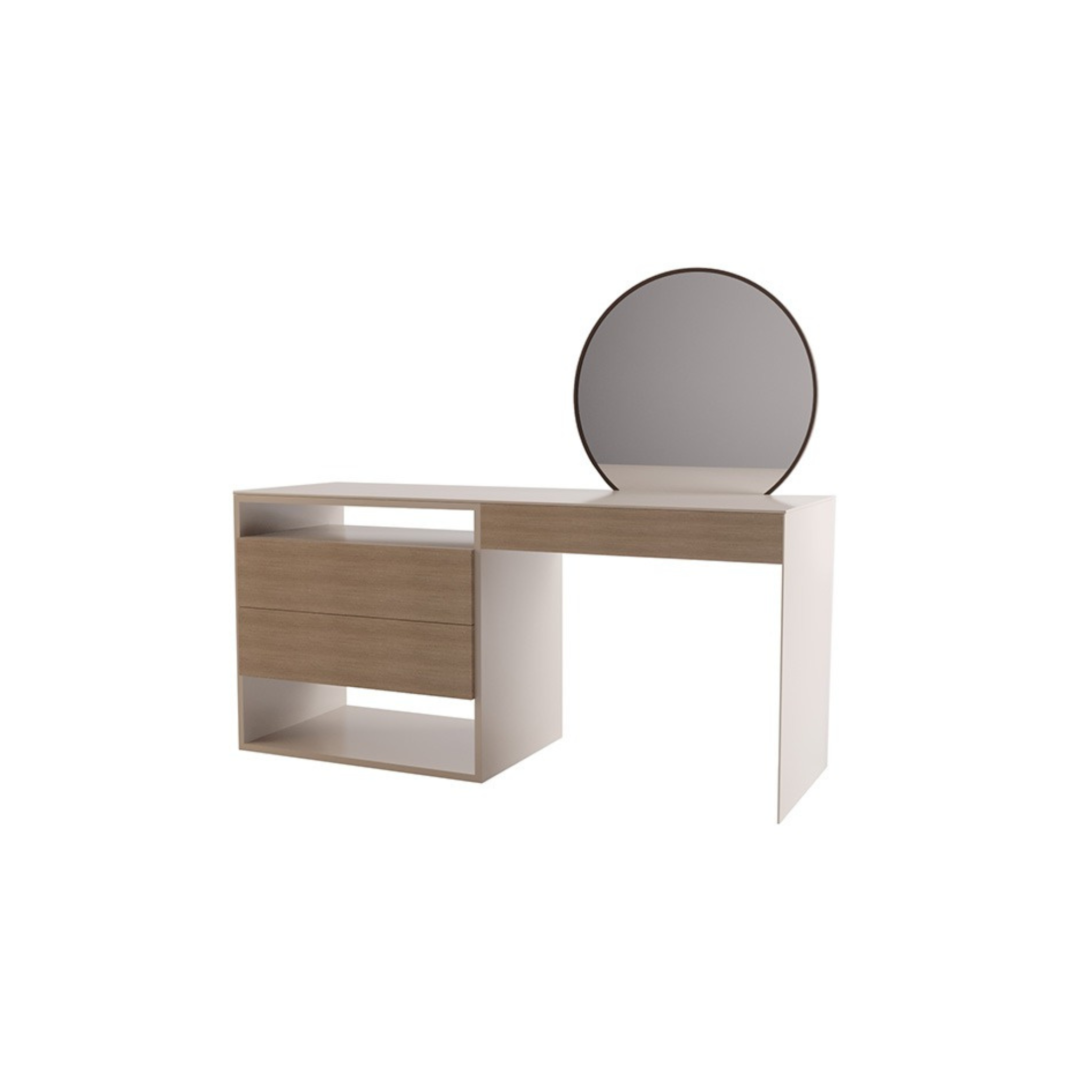 The Clio Dressing Table boasts a sleek, modern design with clean lines and a minimalist structure. It features a spacious tabletop with a built-in circular mirror, combining functionality with aesthetic appeal. The table includes three drawers and an open shelf, offering ample storage while maintaining a clean appearance.