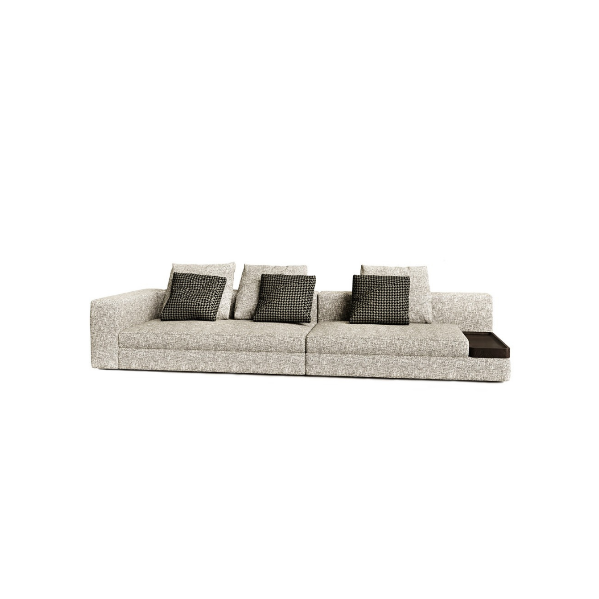 The Clov Sofa redefines modern elegance with its sleek design and low-profile silhouette. Its clean lines are complemented by distinct channel-tufted seating and backrests, adding texture and depth to its contemporary form. A central open shelf enhances its functionality, making the Clov Sofa not just a seating option but a versatile piece that effortlessly adapts to your living space.
