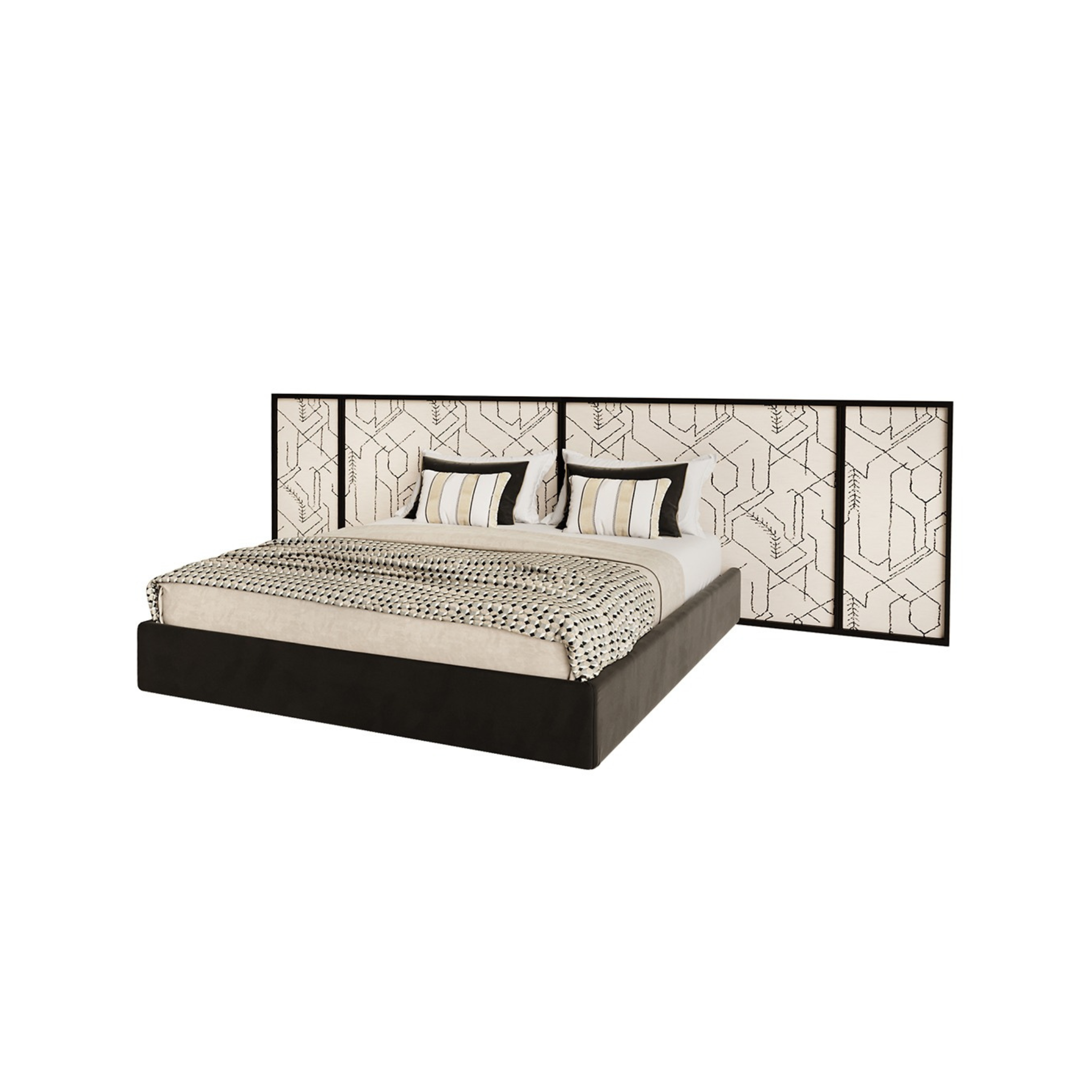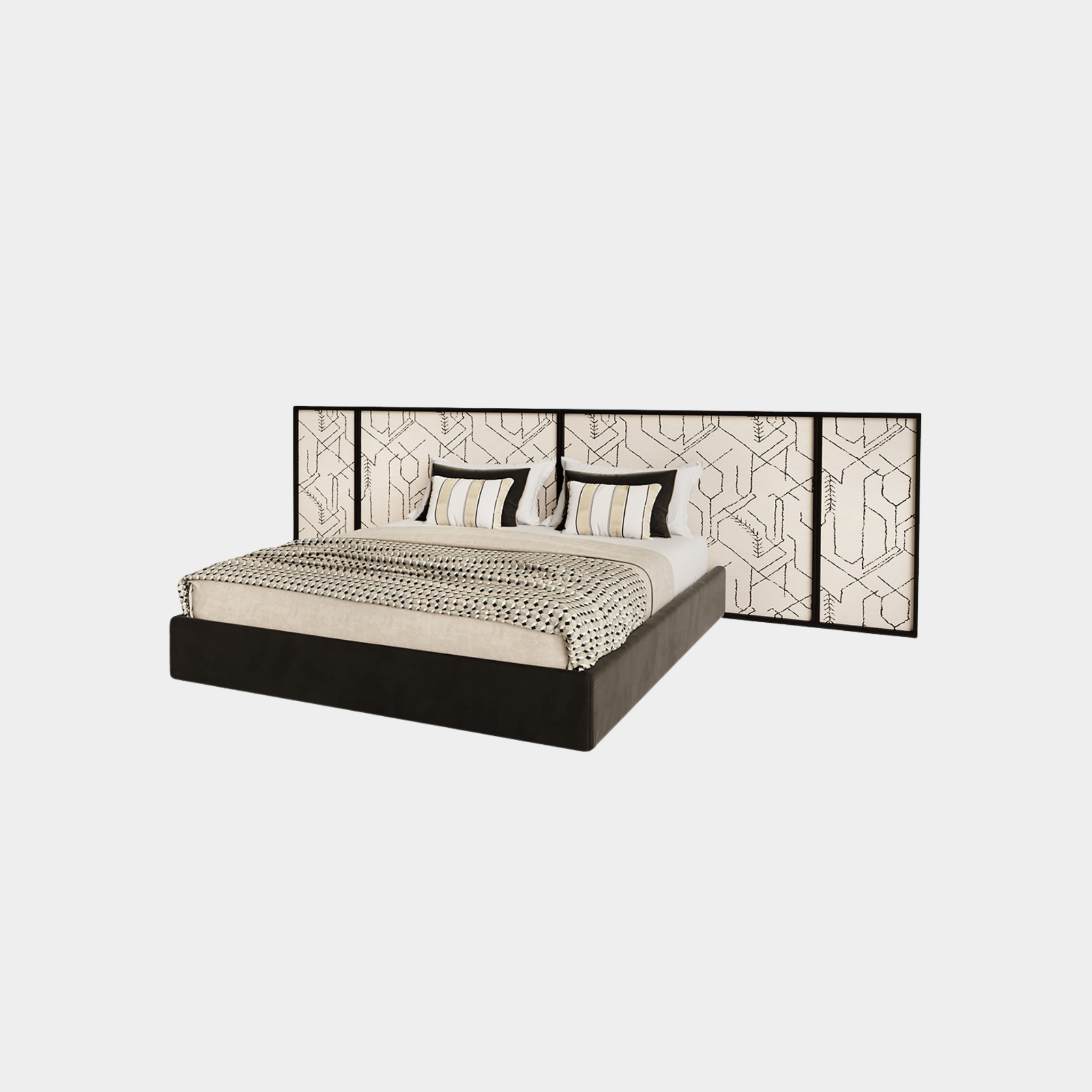 The Emma Bed features a bold and expansive design with a low-profile frame that creates a modern and sleek appearance. The standout element is its oversized headboard, divided into upholstered panels that can be customised, adding a touch of sophistication and visual interest. The bed’s clean lines and substantial headboard make it a striking centrepiece for any contemporary bedroom.