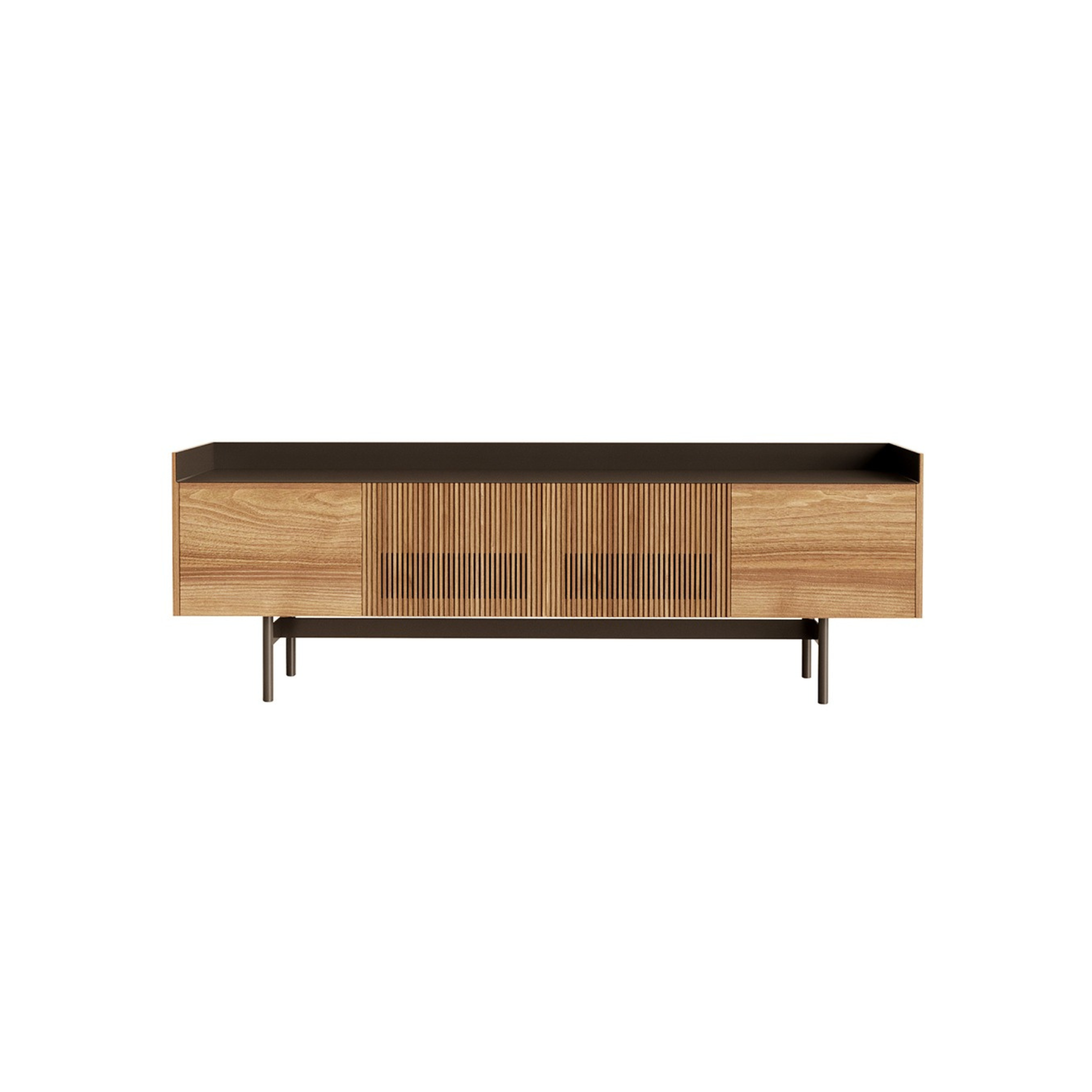 The Lenny Sideboard combines modern aesthetics with functional design. It features an elevated top, sleek metal legs, and a center section adorned with vertical slats, making it both stylish and practical.
