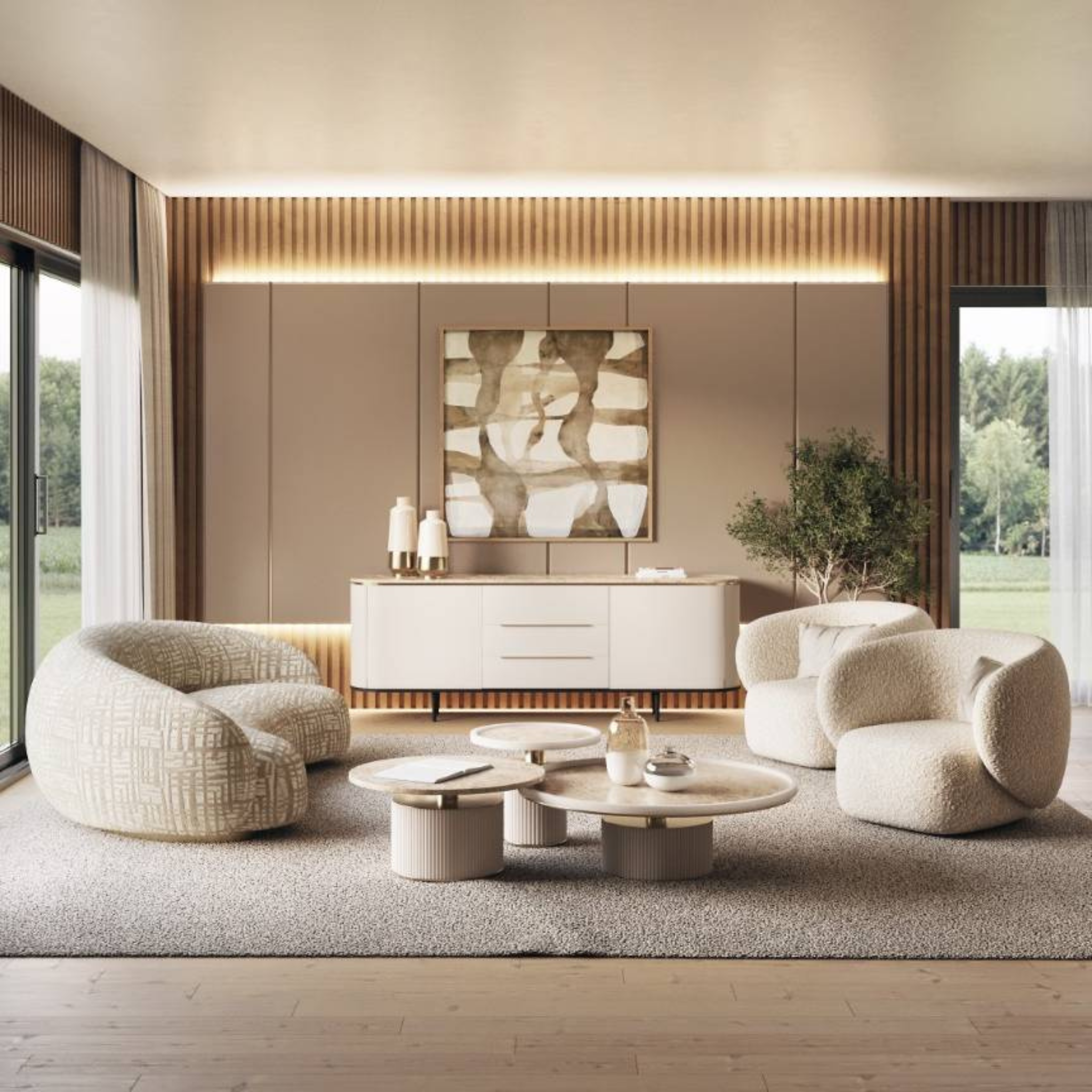This chic sideboard combines a robust, rounded wood body with a refined marble top, creating a perfect balance between materials. Featuring two doors and three drawers, the Venice Sideboard maintains its elegant beauty while fitting seamlessly into any room or setting.